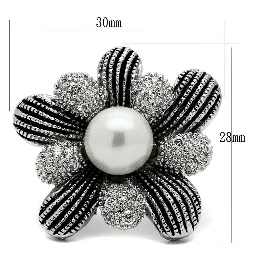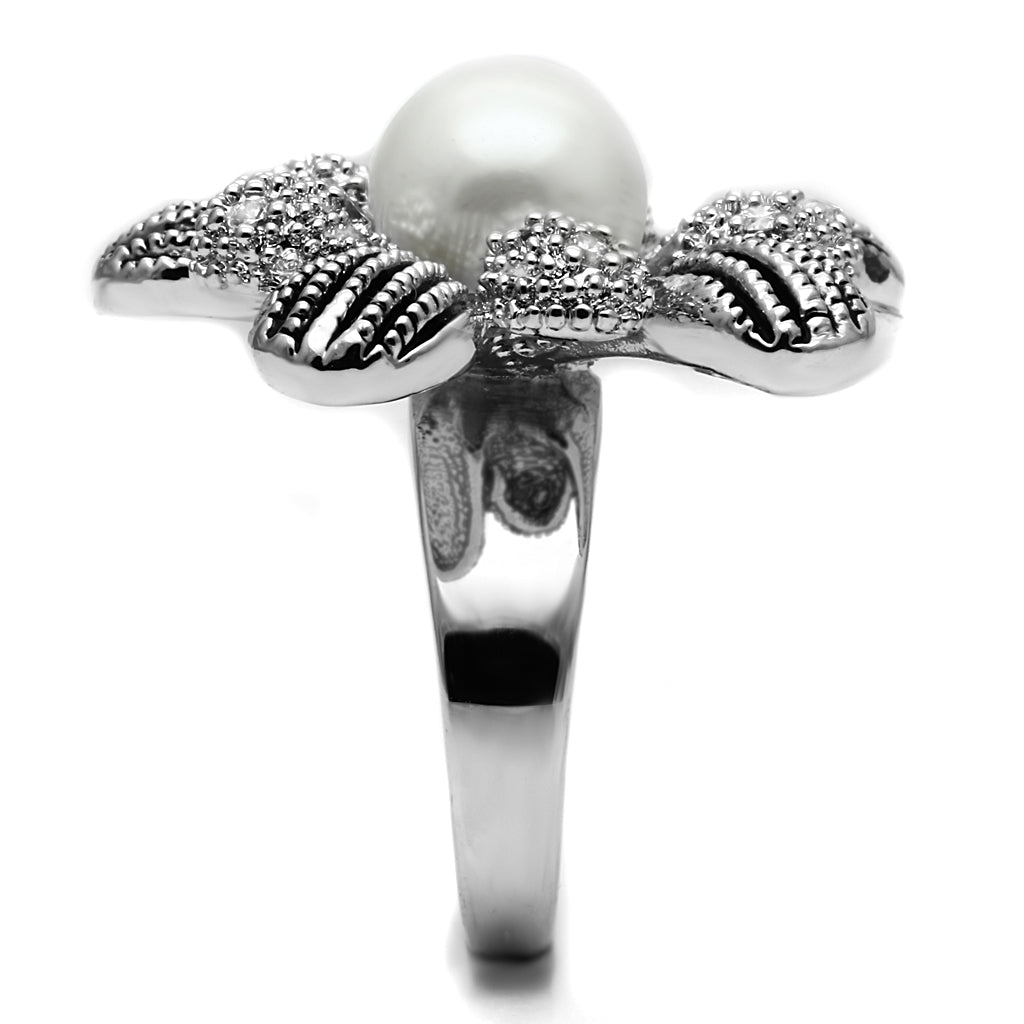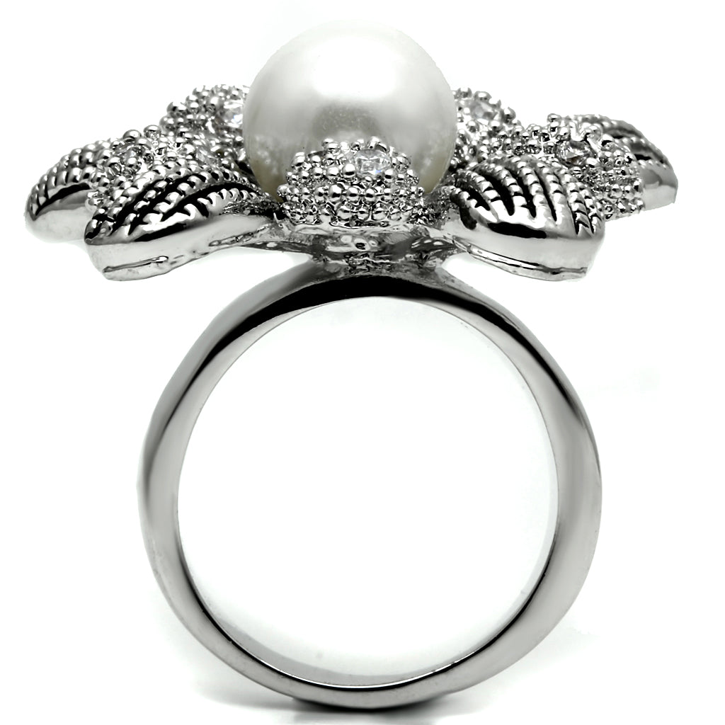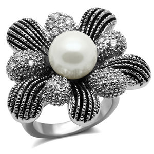 CeriJewelry's stainless steel floral ring is perfect for customers looking for cocktail rings. This piece features a white pearl at the center of the floral design.