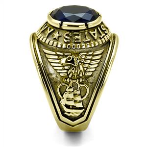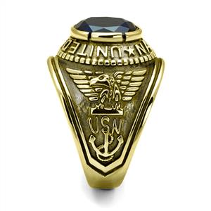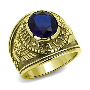 A gold plated stainless steel united states navy ring adorned with a montana stone.