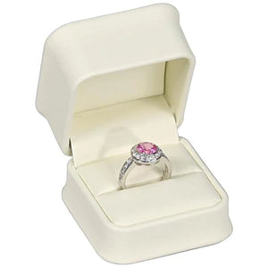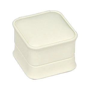 The ring box features a soft, cream-colored leatherette exterior and a cream-colored interior leatherette. Each box includes a brown two-piece packer.