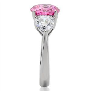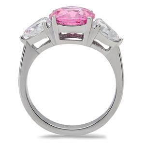 Indulge yourself in this sophisticated CZ engagement and wedding ring. Sitting gracefully atop a stainless steel band is a perfect round cut CZ stone gleaming in a radiant pink and adorned with beautifully cut CZ stone sitting on each side of the center stone. Complement your wardrobe with this CZ bridal jewelry and be sure to dazzle everyone around you.Stainless steel jewelry is durable and does not tarnish. Not only is stainless steel one of the strongest metals, it also does not oxidize. Stainless steel jewelry can be easily cleaned with warm water and a clean cloth, thus forgoing purchasing expensive jewelry cleaners. In addition, those who are allergic to nickel can wear stainless steel jewelry as it is a hypo-allergenic product.