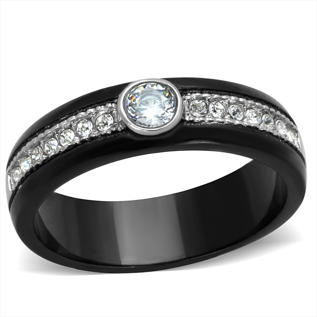 This stylish, IP black plated stainless steel band has a sense of flair with a stunning band of CZ pave bordering a brilliant CZ center stone. This ring is fun enough to rock with a night out look.