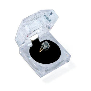 Crystal-cut gift Plastic Ring Boxes with velvet liners. Includes tunk-in packer.