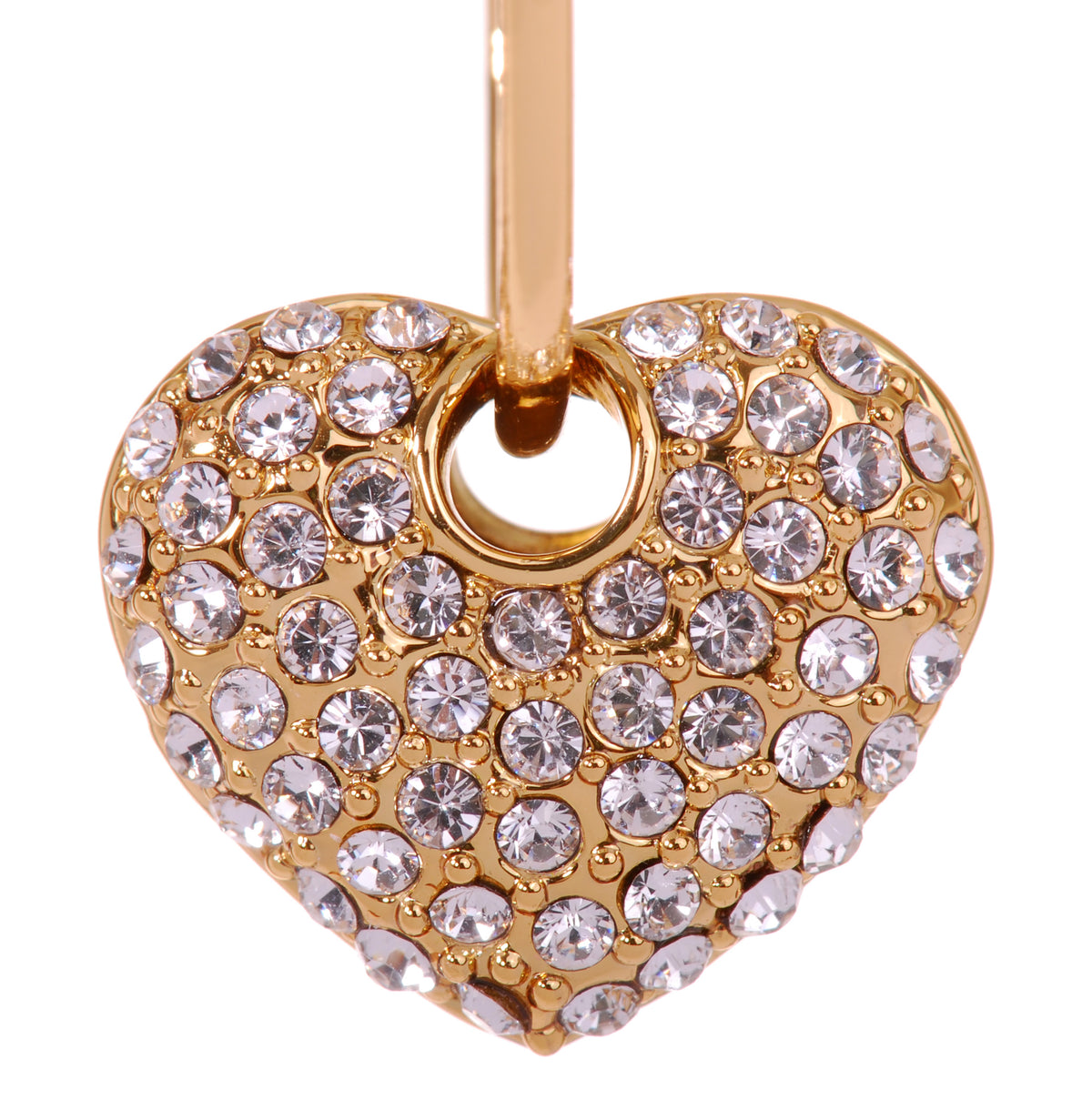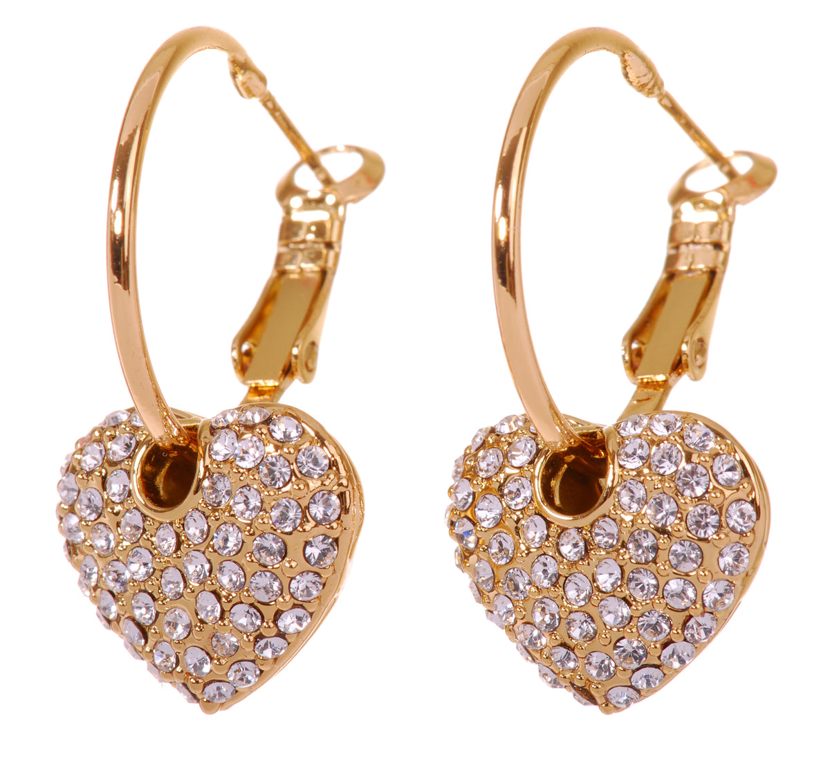 These beautiful 18k yellow gold earrings are composed of an unique drop heart design that is accented with genuine Swarovski Elements pave. These beautiful earrings can be worn with your favorite evening looks or just jeans and a t-shirt. Whichever your options you are sure to look undeniably elegant with these heart accented earrings,