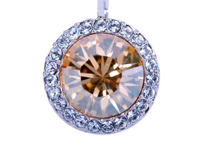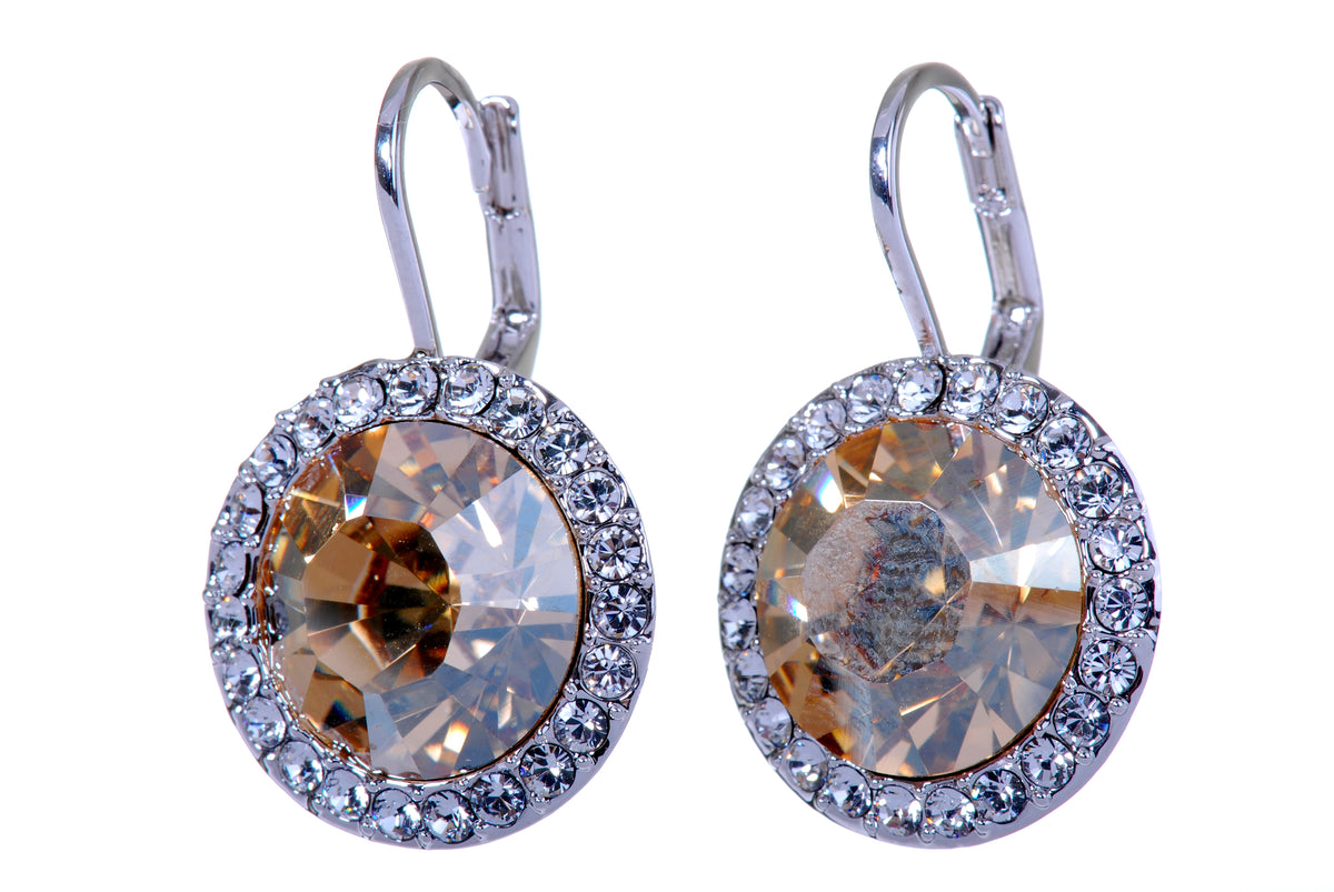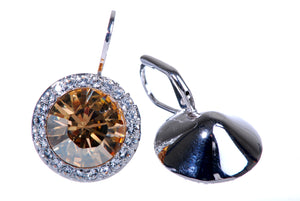 This stunning arrangement of premium Swarovski Elements crystal makes this pair of earrings truly a sight to remember. This pair boasts a dazzling brilliant round cut Swarovski centerstone nestled inside a high polished rhodium plated setting. A truly elegant pair that is ideal for almost any occassion.