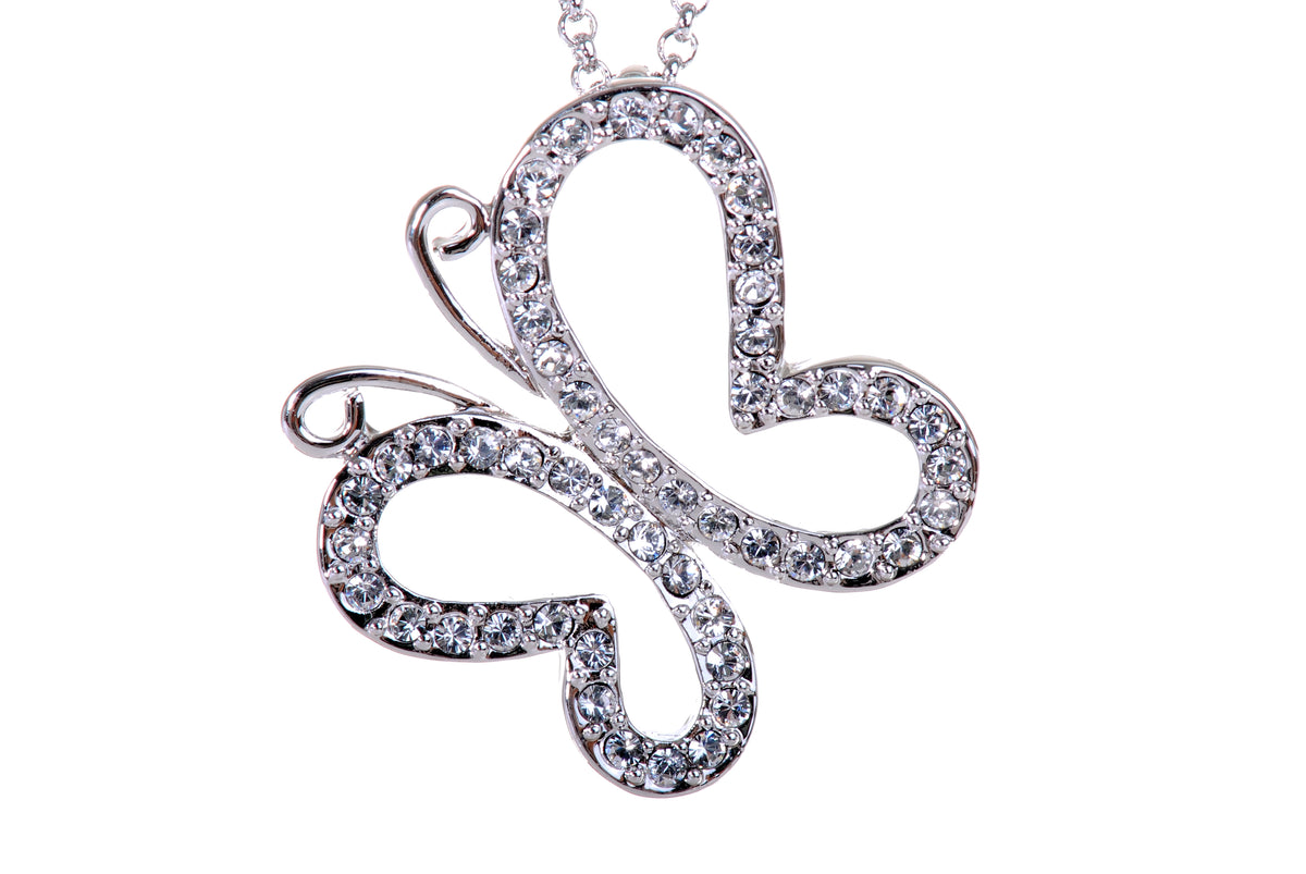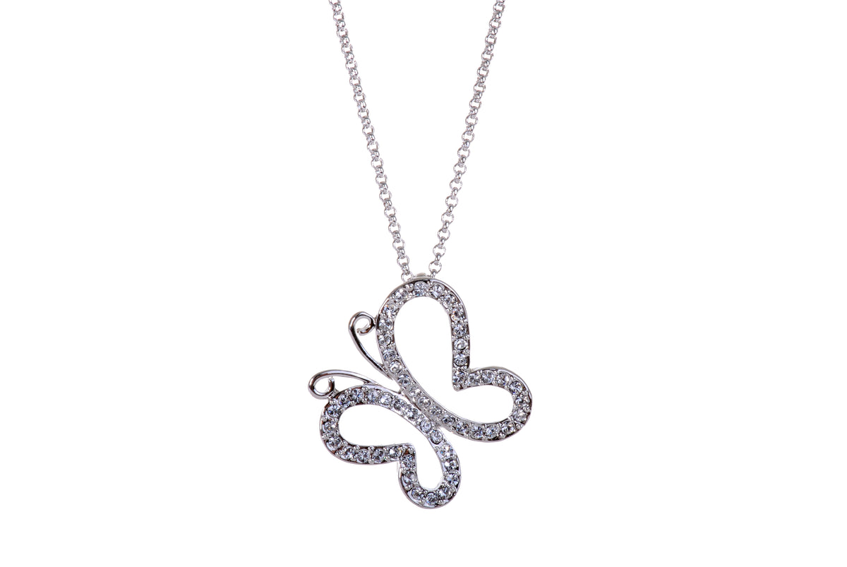 Flirty and whimsical, this stunning butterfly pendant hangs gracefully from this necklace. This piece boasts dozens of hand placed round Swarovski Elements crystals atop a rhodium plated setting.